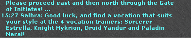 Bueno pasando todo el festival, al norte nos encontramos con una pequeña villa, en cada casa encontrarás a un NPC, quien te dará la información referente a cada profesión que practica, claro es tu decisión si quieres ser un valiente caballero, un honorable paladin, un magestuoso druid o un poderoso sorcer, cada NPC tiene la habilidad de darte la profesión que tu desees, tal como lo hice yo al elegir ser Sorcerer con la grandiosa Sorcerer Estrella.